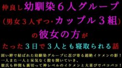ノベル 転校してきたヤリチンイケメンに仲良し幼馴染6人グループ(男女3人ずつ・カップル3組)の彼女の方がたった3日で3人とも寝取られる話【d_759755】【犬ソフト】 ノベルビッチ中出し女性視点学園もの学生寝取られ・NTR寝取り・寝取られ・NTR幼なじみ成人向け浮気犬ソフト男性向け転校してきたヤリチンイケメンに寝取られる話